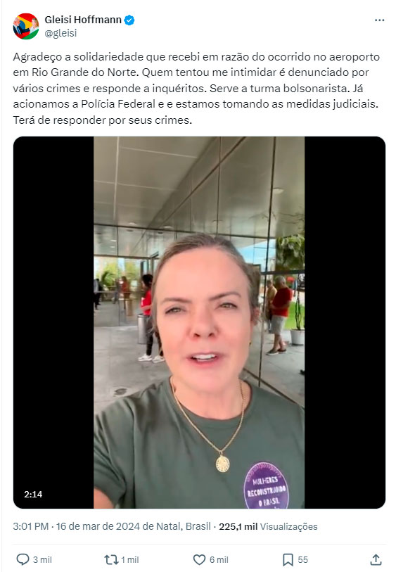 Deputada Gleisi Hoffmann aciona PF contra jovem do MBL que a abordou em aeroporto