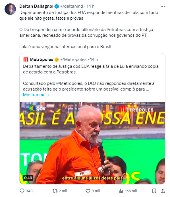 POLÍTICA Departamento de Justiça dos EUA desmente Lula e apresenta provas de corrupção na Petrobras REDAÇÃO 20/01/2024 as 10:07 am Compartilhe: Quer receber notícias no seu WhatsApp? Então, entre no grupo do Fato360 agora!