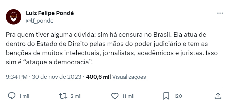 POLÍTICA Filósofo Luiz Felipe Pondé critica STF por Censura REDAÇÃO 01/12/2023 as 7:10 pm Compartilhe: Quer receber notícias no seu WhatsApp? Então, entre no grupo do Fato360 agora!